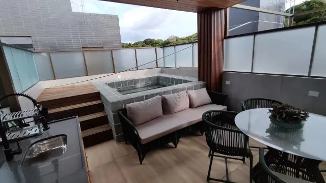 O condomínio oferece uma estrutura de lazer completa, com destaque para a piscina e vista parcial para o mar de Cabo Branco. Além disso, conta com área gourmet com churrasqueira, geladeira e mesa.