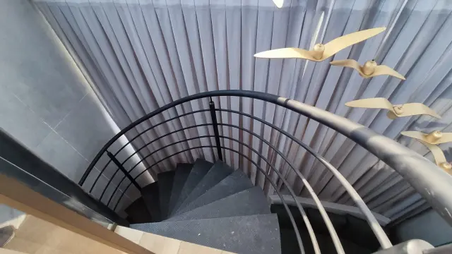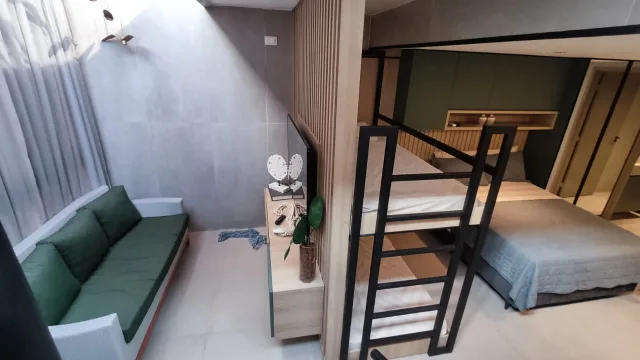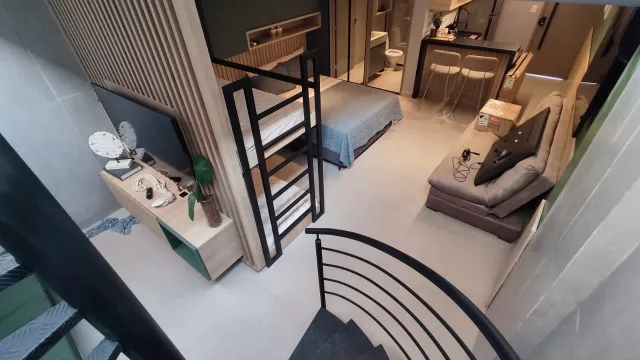 O flat duplex no Cabo Branco se destaca pelo layout inteligente e bem distribuído em dois andares. No pavimento inferior, encontramos uma ampla suíte integrada à cozinha americana, totalmente equipada e decorada com móveis planejados, eletrodomésticos modernos e acabamento de alto padrão, além de uma sala com sofá e televisão. Um ambiente acolhedor, ideal tanto para relaxar quanto para receber amigos.