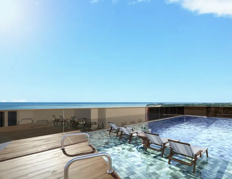New Wave Home Flat | R$ 549.000 – 780.000 | Academia, piscina, salão, recepção, flats modernos | Localização à 70m da praia, infraestrutura premium |